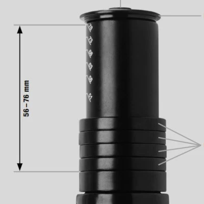 Compatible avec une potence ahead de 28,6 mm (soit 1 1/8″), comme la potence ahead Octopus 2 Ergotec, l’adaptateur propose un espace pour sa fixation entre 56 et 76 mm de haut (voir photo 3) en plus de l’attache de 40 mm de haut. De même, il s’installe sur le tube de direction du vélo classique ou vélo à assistance électrique dont le diamètre extérieur mesure aussi 28,6 mm. Attention alors à vérifier que vous avez assez d’espace pour faire entrer le produit dans la fourche : 38 mm minimum. Si c’est bien le cas, faites glisser le système et serrer les vis de fixation. Pour plus de détails, consultez la notice de l’adaptateur de potence ahead Ergotec.