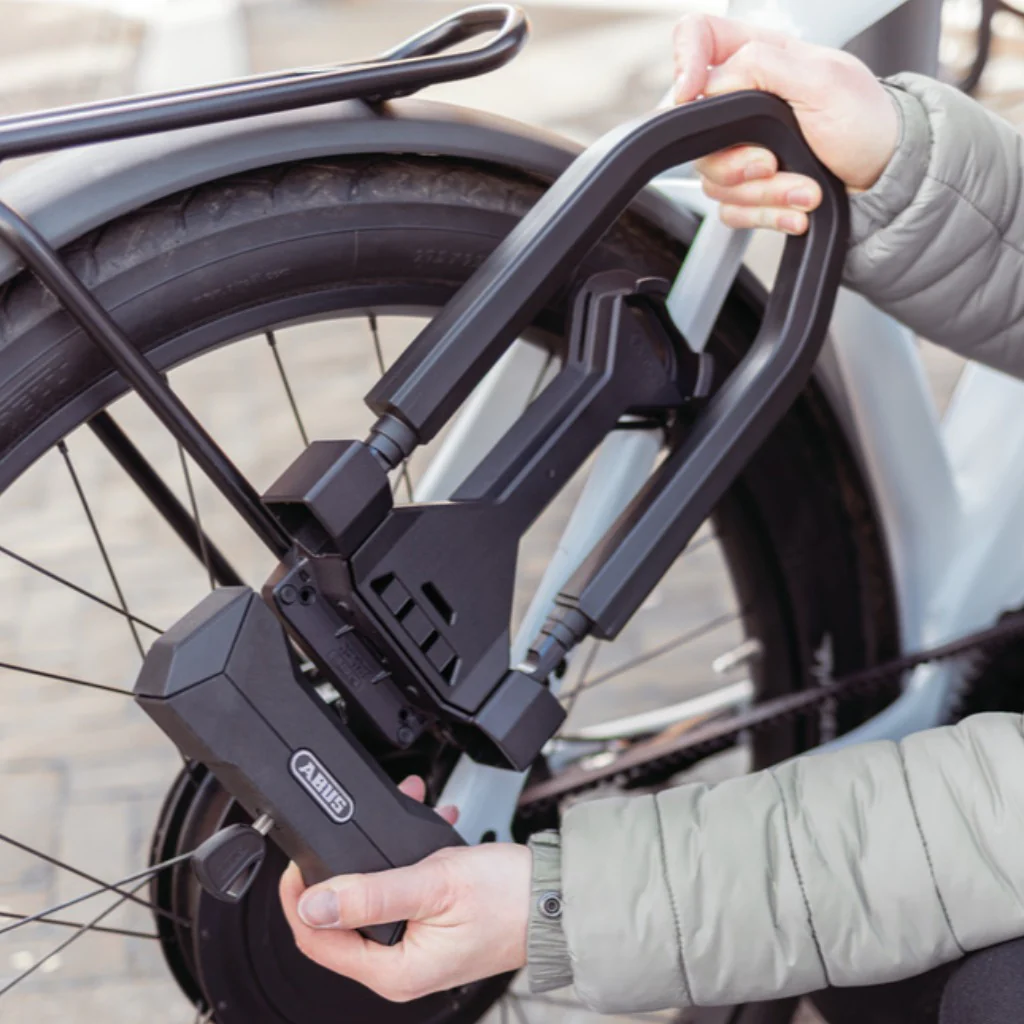 Les éléments porteurs du verrouillage et le boitier sont en acier cémenté et l’antivol est équipé du cylindre ABUS XPlusâ„¢. En plus d’une protection efficace contre les meuleuses, votre vélo est ainsi très bien protégé des tentatives de vol telles que le crochetage.