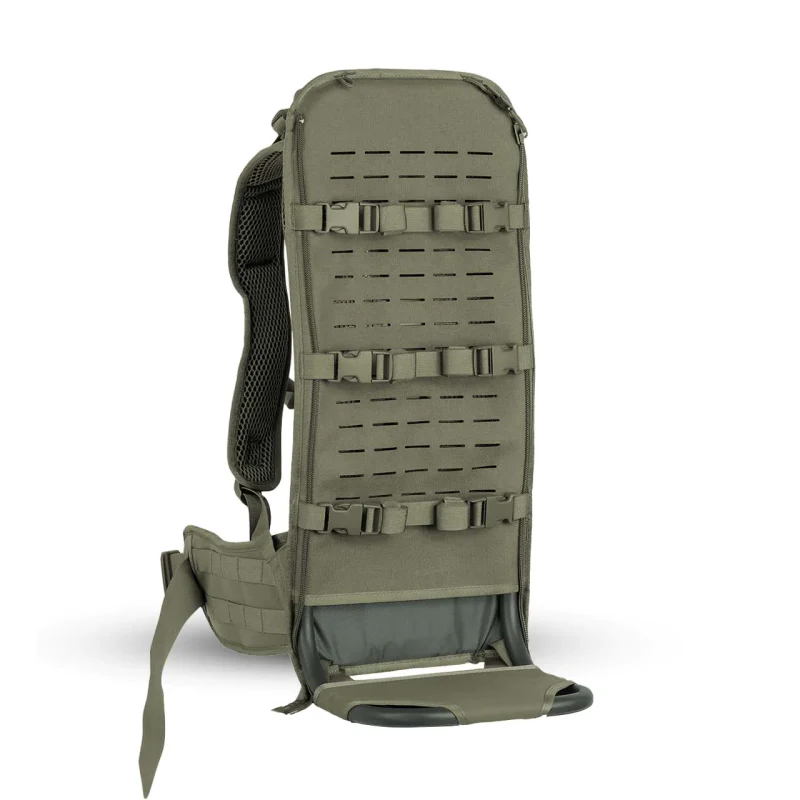 Élaboré pour constituer le cœur du système EMOD™, il permet la fixation de multiples sacs et accessoires via une matrice MOLLE et des points d’attache zippés, assurant une configuration sur mesure selon l’opération. Les fermetures YKK et le châssis aluminium/nylon apportent résistance et sécurité, tandis que les sangles de compression intégrées stabilisent la charge pour des déplacements maîtrisés en conditions exigeantes.
