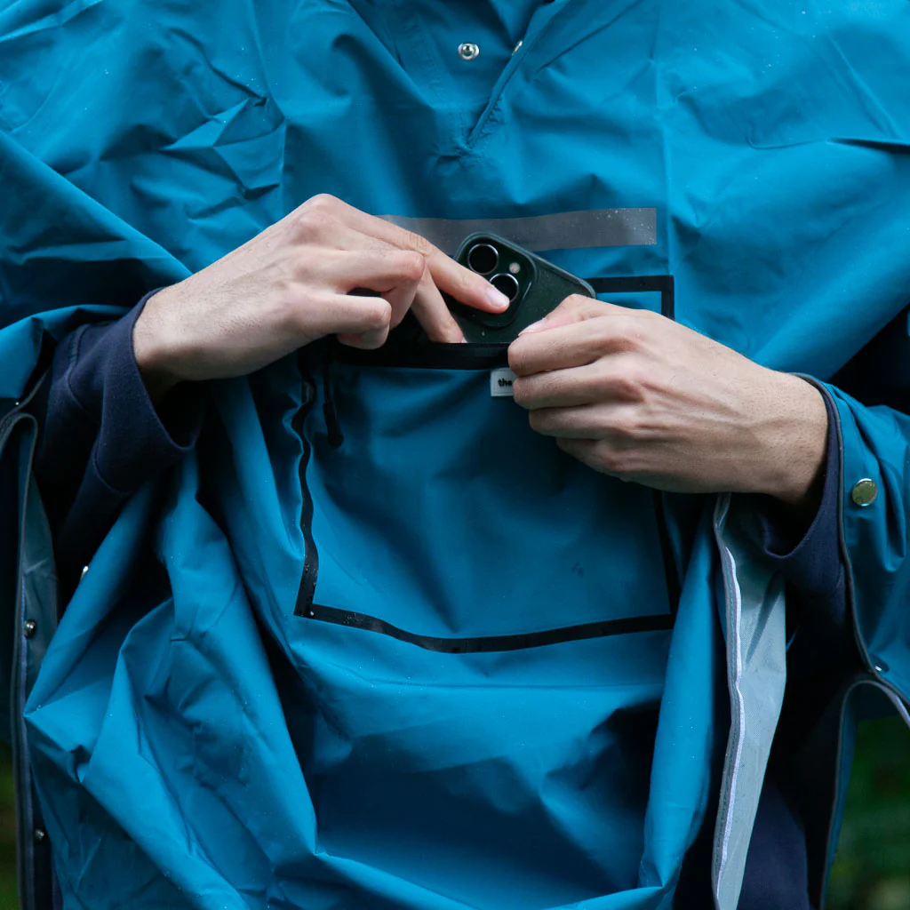 Avec seulement 460 g, la cape de pluie The Peoples Poncho est légère et facile à transporter, d’autant plus qu’elle vous est livrée avec une jolie pochette de transport à bandoulière. La pochette est assez spacieuse pour y faire tenir le poncho et quelques menus items comme vos clefs et un porte-monnaie. Le poncho est aussi pourvu d’une poche zippée sur le devant.