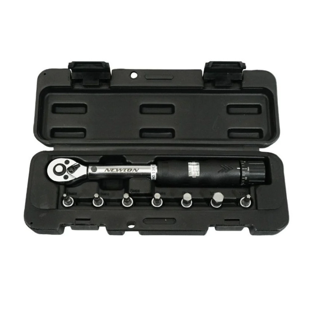 Clé dynamométrique pour le serrage et desserrage de pièces vélo avec embout 1/4″, serrage de 2 à 14 N avec douilles Allen 2-3-4-5-6-10 et Torx T25. La clé est livrée dans une pratique mallette à outils. Parfait rapport qualité-prix !