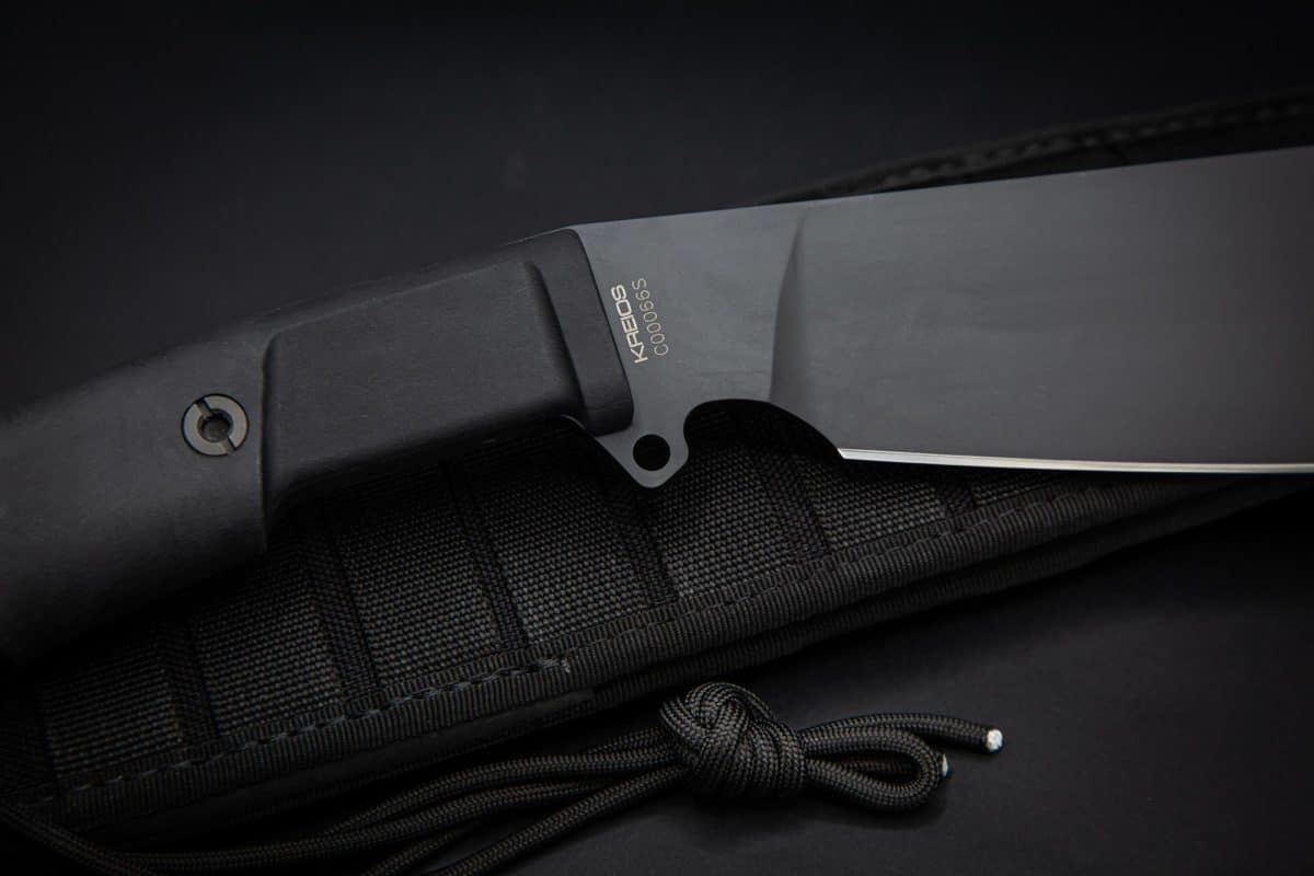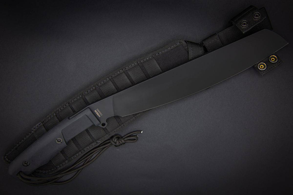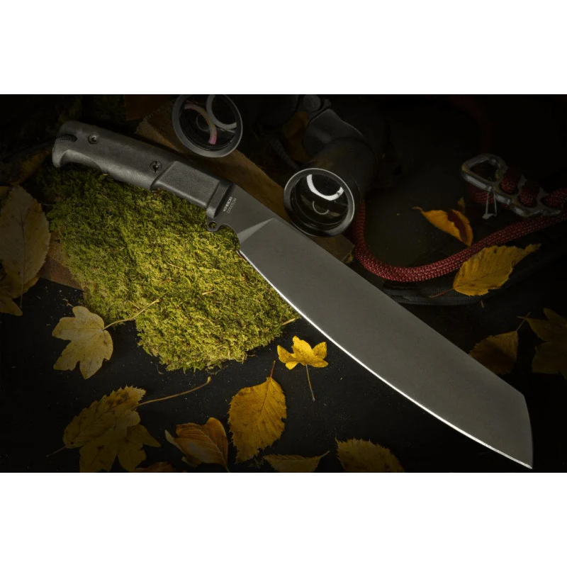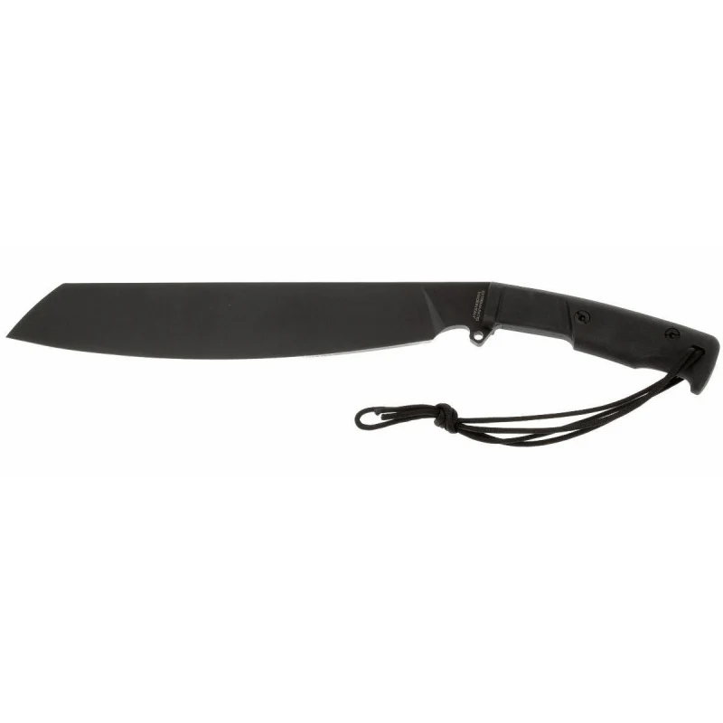 Sa lame en acier Böhler N690 trempé (~58–60 HRC) offre une géométrie efficace pour des coupes franches et maîtrisées. La longueur utile atteint 32,4 cm, l’épaisseur de 6,3 mm garantit stabilité et contrôle, et la longueur totale de 47,6 cm, pour 642 g, maintient un équilibre cohérent entre inertie et maniabilité au service de la performance en opération.