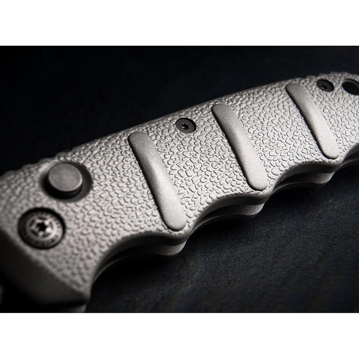 La conception ergonomique de la poignée, fabriquée en aluminium, offre une prise en main sûre et confortable. Les rainures intégrées renforcent cette prise, permettant une manipulation en toute confiance, même dans des conditions difficiles. La lame, quant à elle, est en acier inoxydable D2, reconnu pour sa robustesse et sa durabilité.