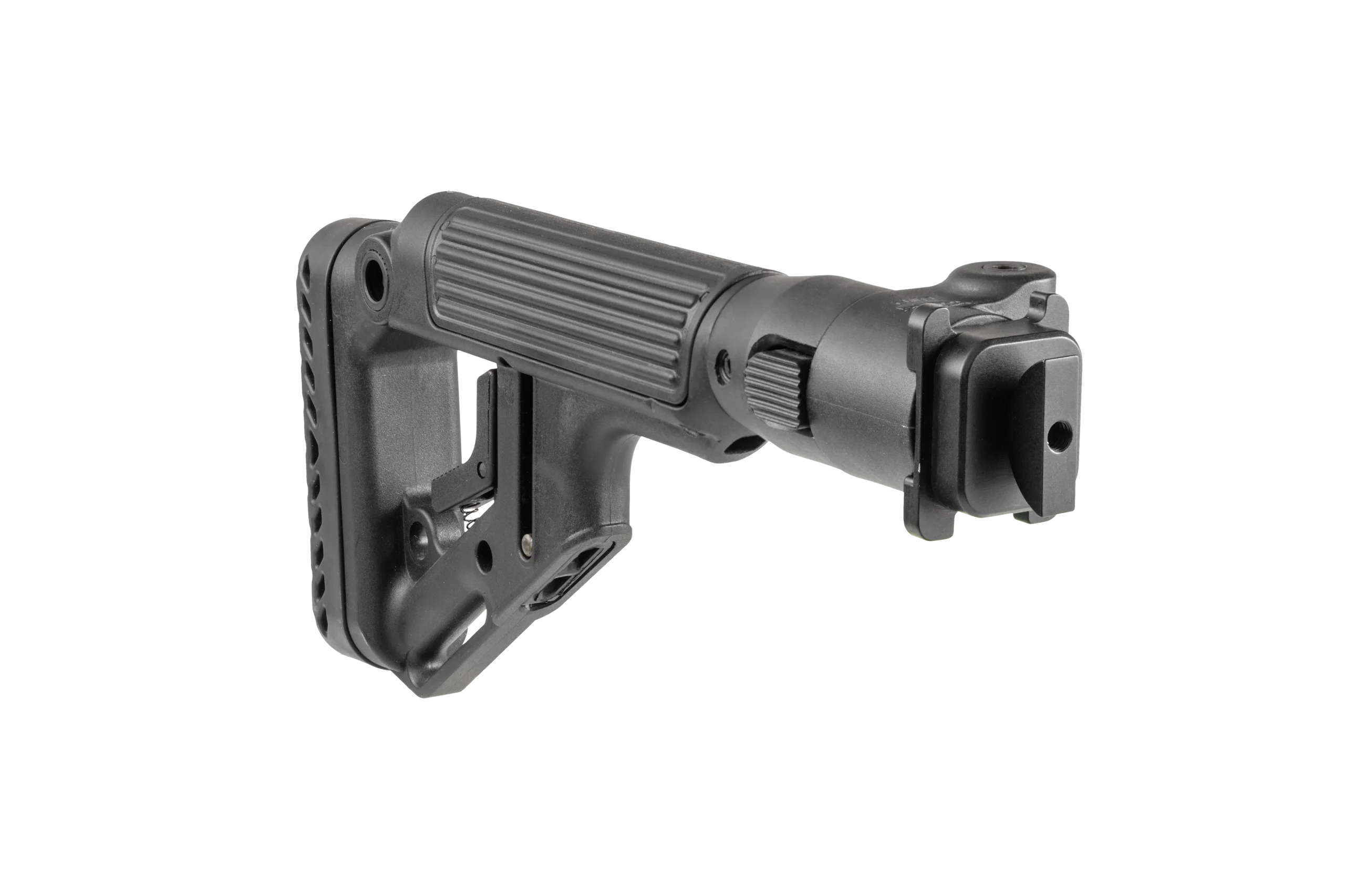 Le réglage rapide de la longueur améliore l’ergonomie et assure une position stable, tandis que le verrouillage par bouton garantit une manœuvre fluide et sécurisée. La configuration de pliage à gauche ou à droite s’adapte aux préférences et aux impératifs du terrain. L’embout en caoutchouc améliore l’absorption du recul et la tenue en épaule, ce qui stabilise le tir et renforce la précision, la sécurité et l’efficacité.