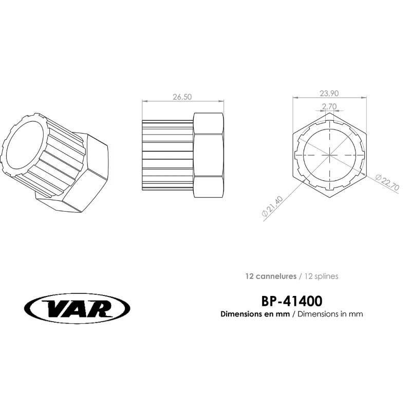 Pour être compatible avec les boitiers Campagnolo, l’outil VAR BP-41400 dispose de 12 cannelures d’une largeur de 2,70 mm chacune. La longueur de l’outil est de 26,50 mm, et la largeur de l’écrou est de 23,90 mm.