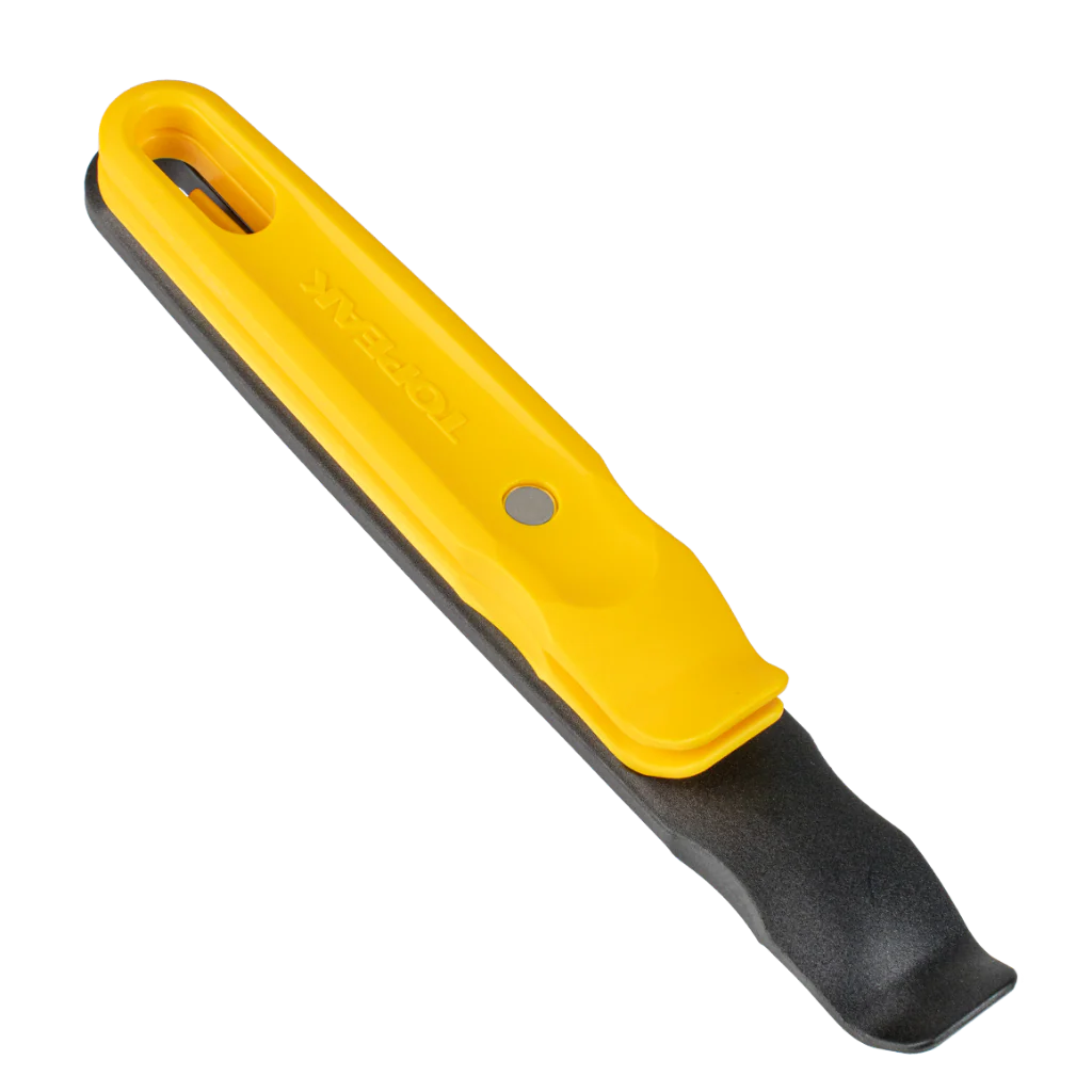 La paire démonte pneu Shuttle Level Pro de Topeak est un petit outil en plastique polymère résistant qui contient en fait deux démonte-pneus qui se clipsent l’un sur l’autre. Le premier démonte pneu, noir, mesure 14 cm de longueur. Il est fait dans un matériau particulièrement solide, mais qui ne risque pas d’abimer la jante de la roue comme pourraient le faire certains démonte pneu en métal. Les deux jaunes sont plus courts, mais ils possèdent chacun un crochet à rayon pour rester bien en place pendant que vous déposez le pneu. Ces outils s’emboitent grâce à un système magnétique pour tenir en place.