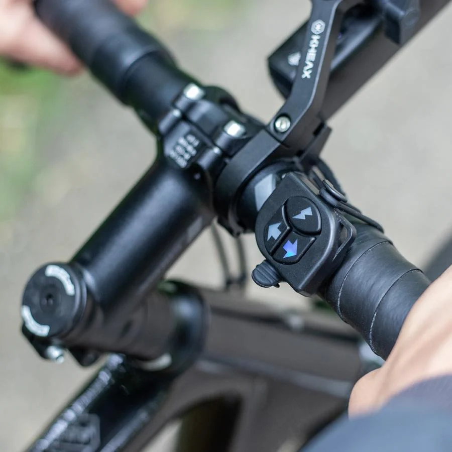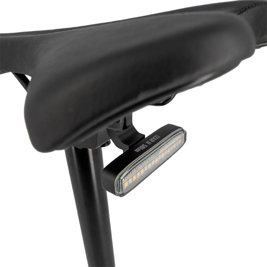 L’éclairage arrière Kheax Izar II est conçu pour assurer la visibilité du cycliste par les usagers arrivant de l’arrière. Doté d’une puissance de 50 lumens et de 17 LED SMD (8 rouges et 9 jaunes), cette lumière permet aussi de signaler tout changement de vitesse ou de direction. Avec ses clignotants séquentiels actionnés depuis une télécommande fixée au guidon, il avertit les autres usagers de vos changements de direction et déclenche automatiquement le feu stop grâce à un accéléromètre intégré, lorsque vous freinez.
