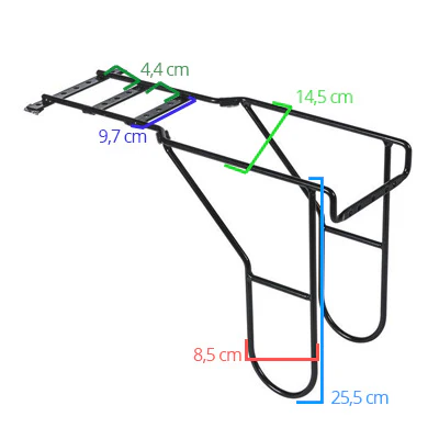 De couleur noire, l’extension en acier est dotée d’une plaque de fixation arrière pour installer un éclairage vélo. L’écart entre les vis doit être compris entre 50 et 80 mm.
