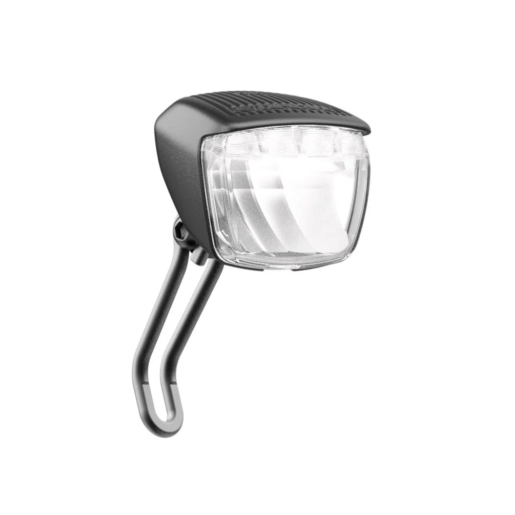 Ce feu avant pour vélo se connecte à votre dynamo moyeu (pas de piles, pas de batterie !) et vous fournit un éclairage de qualité de 60 lux, pour vos trajets quotidiens ou vos voyages.