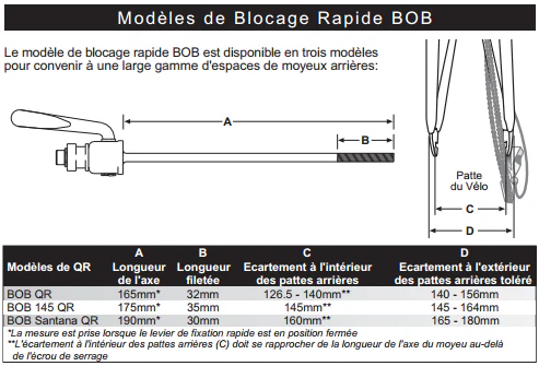- BOB Santana QR de 190 mm de long : pour un vélo avec axe à serrage rapide ayant un écartement à l’extérieur des pattes arrière est de 165 à 180 mm.