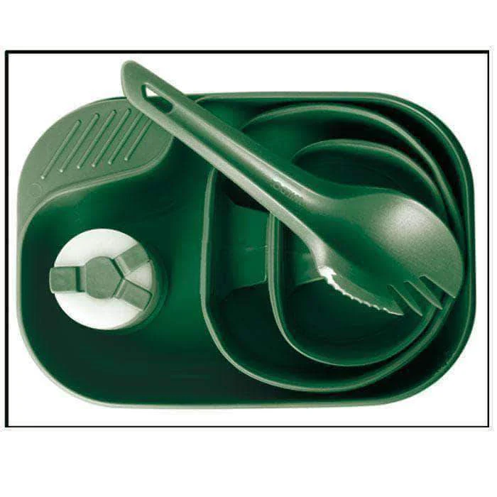 L’ensemble inclut deux coques emboîtables, un quart pliable, un bol, une planche à découper, des couverts et une boîte à condiments. Cette configuration se déploie rapidement, facilite la manipulation et soutient un service propre lors d’une pause courte entre deux phases d’opération ou pendant une patrouille.