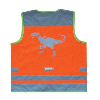 Le gilet de sécurité orange Nutty Jacket de Wowow permet une bonne signalisation de l’enfant avec sa couleur fluo et ses larges bandes réfléchissantes. L’enfant est donc bien visible lorsqu’il est à vélo. Petit plus, le gilet séduira par son motif dinosaure sur le dos. En matière réfléchissante, le dinosaure est bien visible dans le dos du jeune cycliste par faible luminosité. Les bandes réfléchissantes sont présentes sur les épaules, à l’avant, sur les côtés et dans le dos du gilet.