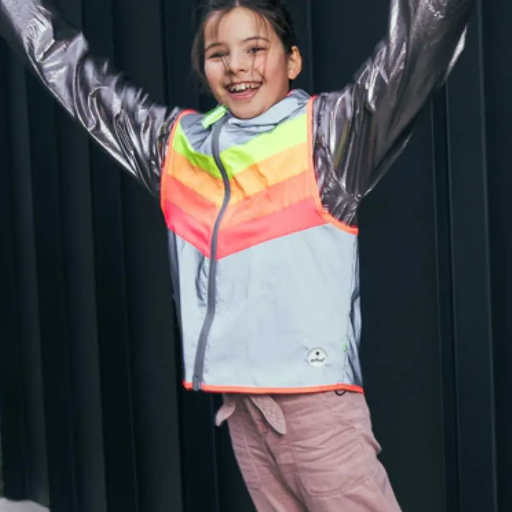 Avec ses couleurs arc-en-ciel fluorescentes et son tissu entièrement réfléchissant, ce gilet attire l’attention de jour comme de nuit, même dans la circulation urbaine dense. Le motif dynamique apporte une touche ludique à la sécurité.