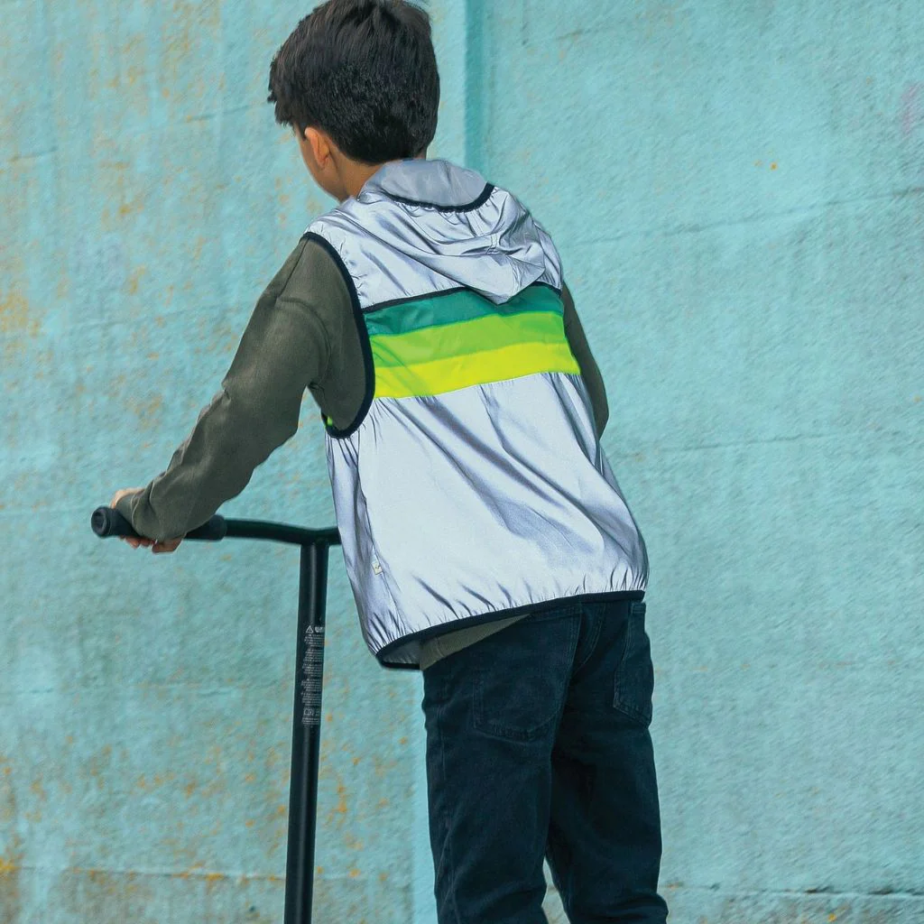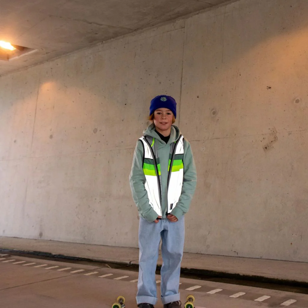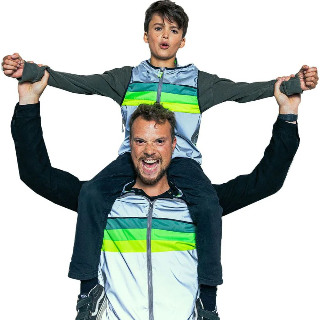 Inspiré par la lueur verte des aurores boréales, ce gilet combine un tissu entièrement réfléchissant à des couleurs fluorescentes recto et verso, pour assurer une visibilité optimale de jour comme de nuit.