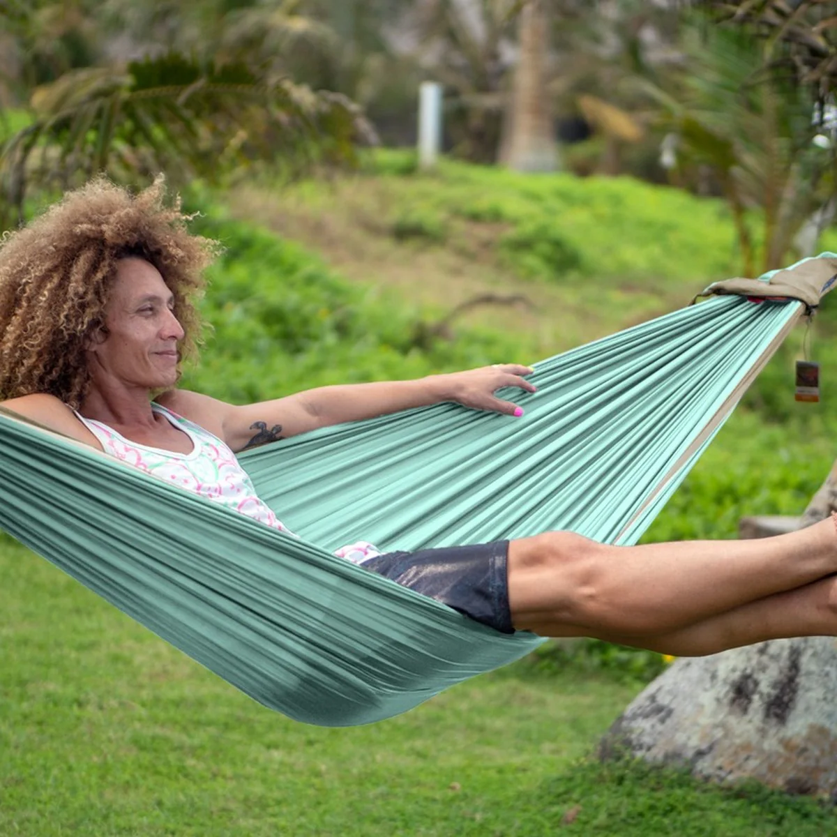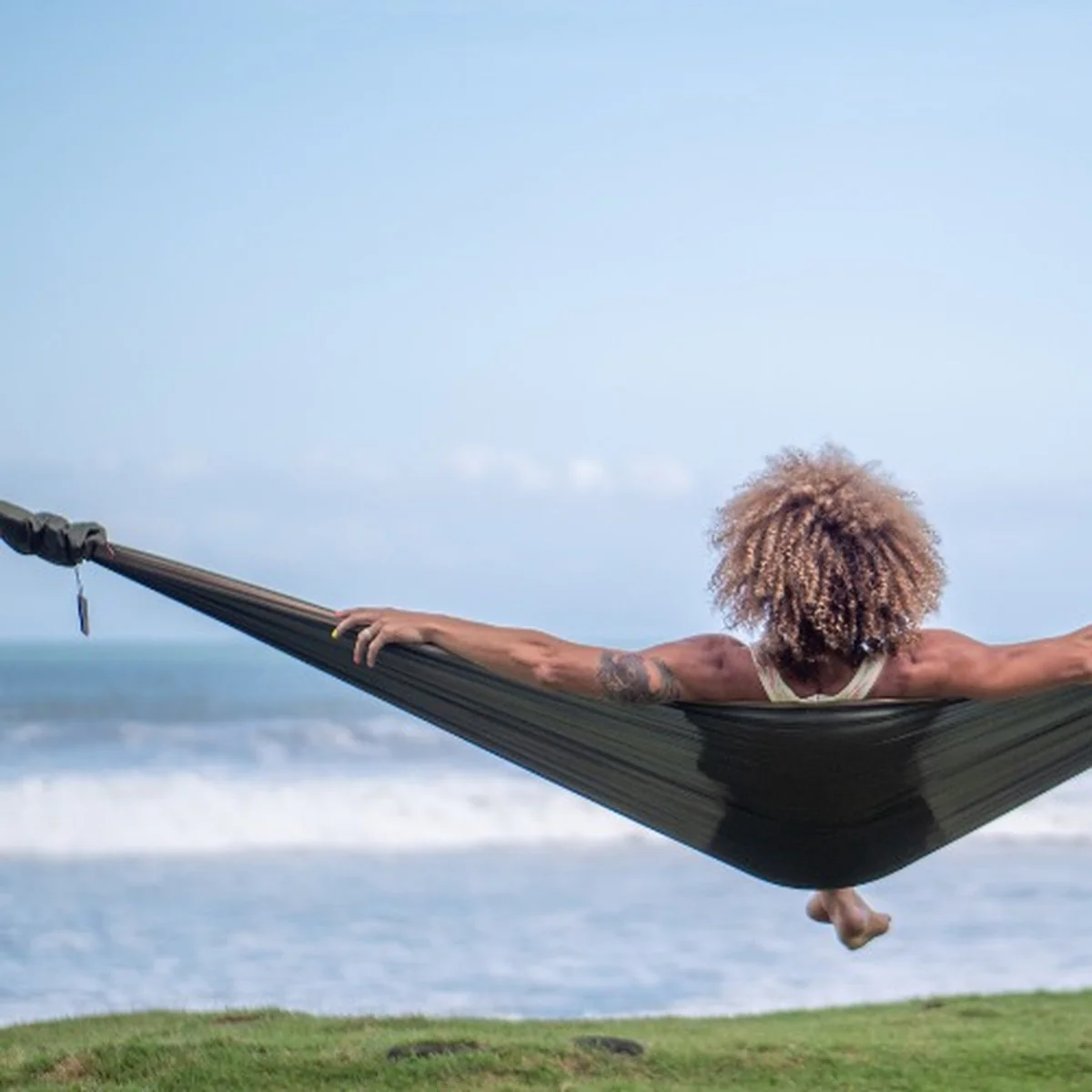 Conçu pour les déplacements, ce hamac affiche un poids de 600 g et se range facilement dans un sac ou une sacoche. Une fois installé, il offre une surface généreuse avec une largeur de 200 cm et une longueur totale de 320 cm (d’hameçon à hameçon), pour se détendre seul ou à deux selon les usages.