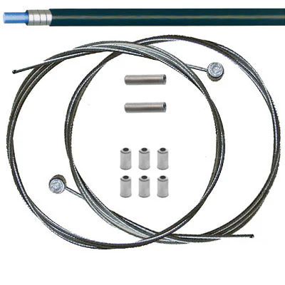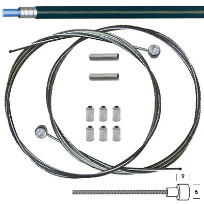 La gaine est en métal inoxydable gainé de plastique noir, son diamètre extérieur est de 5 mm, et son diamètre intérieur est de 2,5 mm. Les câbles de freins pour vélo sont en métal inoxydable, leurs extrémités sont terminées par de butées de 6 x 9 mm, leur longueur est de 2 m, leur diamètre est de 1,5 mm. Et afin de faciliter l’insertion dans la gaine, ceux-ci sont pré-graissés de manière à mieux coulisser à l’intérieur de la gaine.