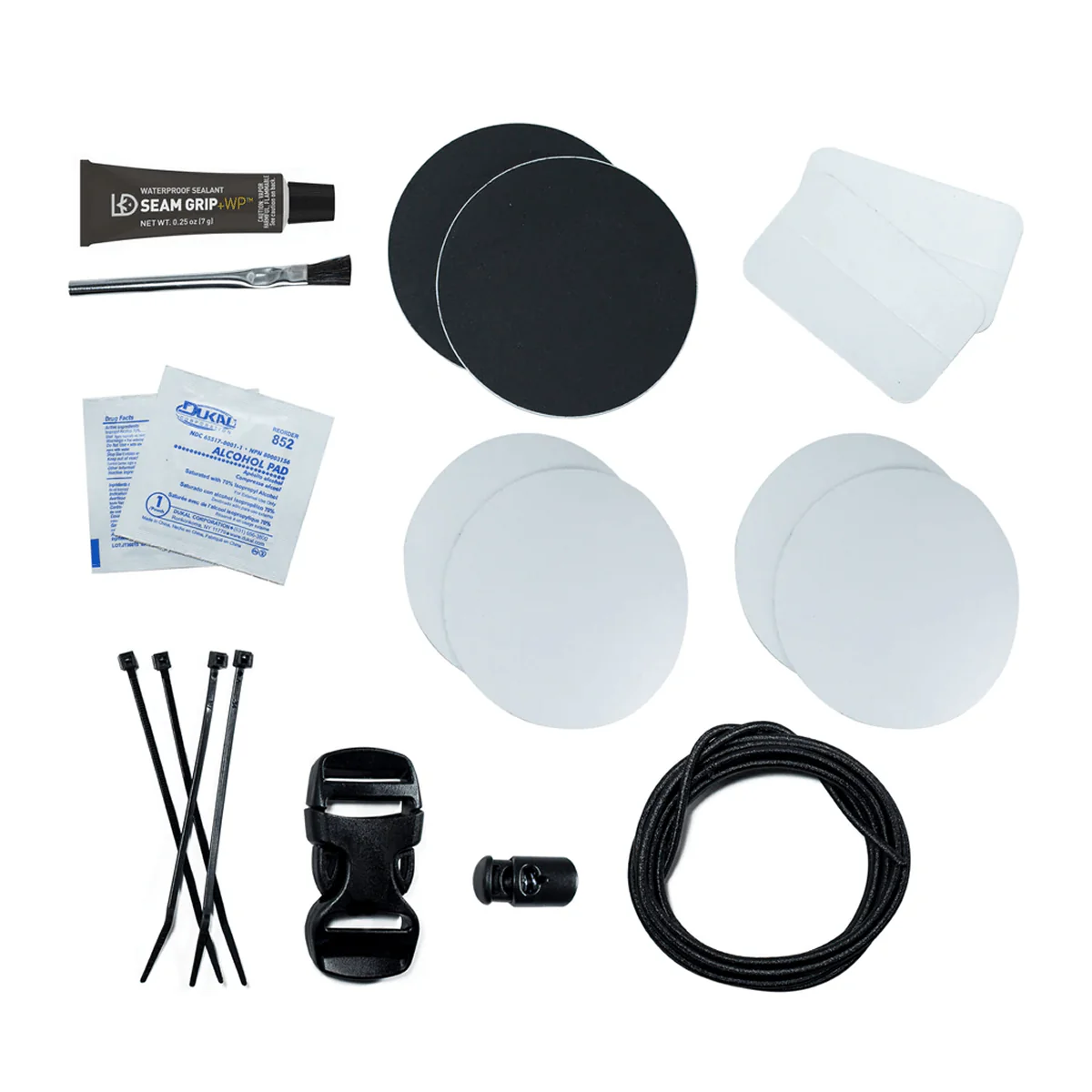 Le contenu réunit des patchs Tenacious Tape transparents de tailles variées, deux patchs en nylon noir, un scellant Seam Grip WP de 7 g avec pinceau applicateur, des lingettes alcoolisées, des attaches zippées, une boucle à double réglage de 2,5 cm, un verrou de cordon Ellipse et 203,2 cm de cordon de serrage. Chaque élément est sélectionné pour répondre aux besoins du terrain, restaurer une couture, combler un accroc ou remplacer une pièce fonctionnelle, tout en conservant la précision des interventions.