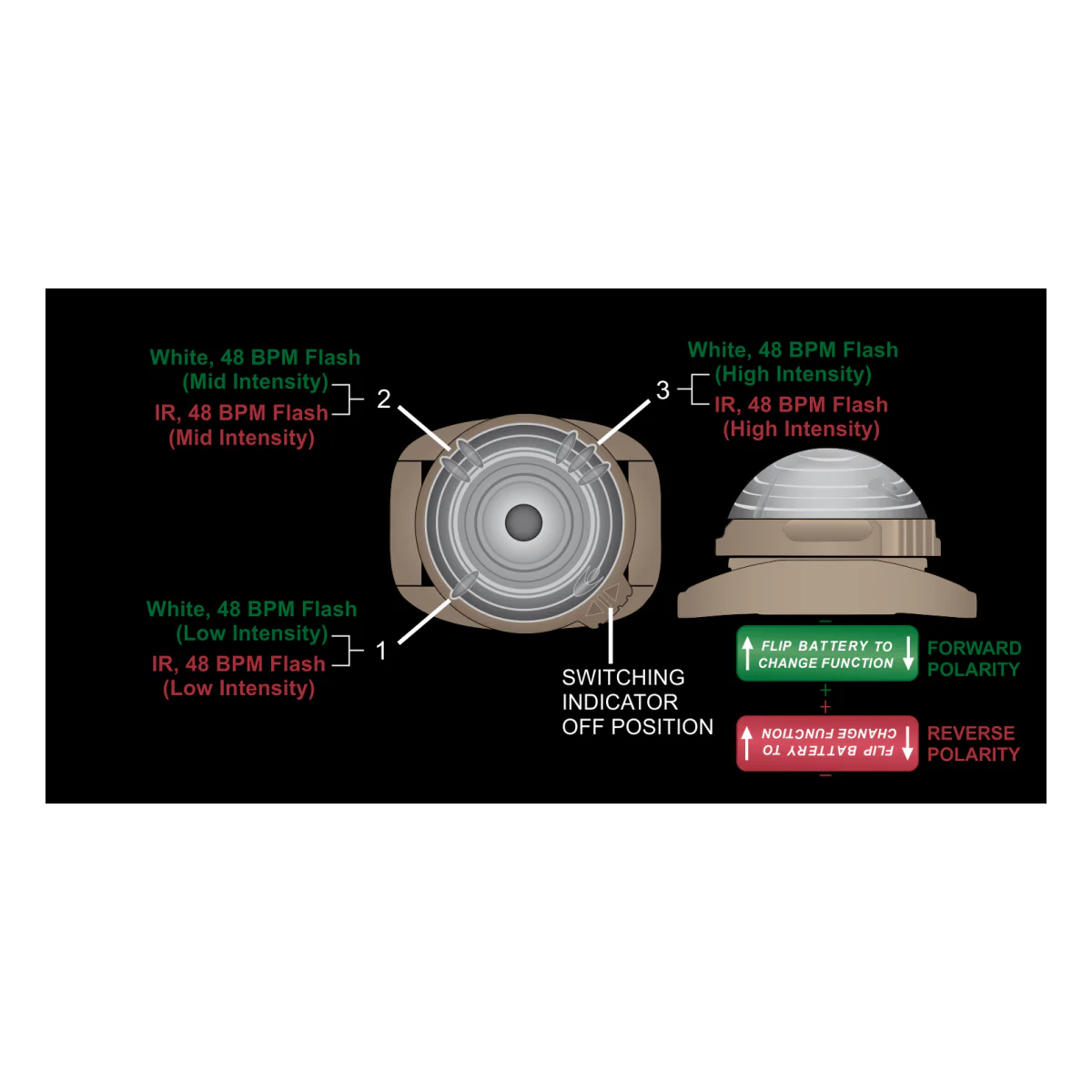 Il offre un éclairage blanc et infrarouge avec un clignotement à 48 BPM pour des signaux lisibles et une coordination efficace. La technologie Reverse Polarity Program Switching® sélectionne le canal lumineux selon la polarité de la batterie, ce qui simplifie l’usage et garantit une fiabilité constante en conditions exigeantes.
