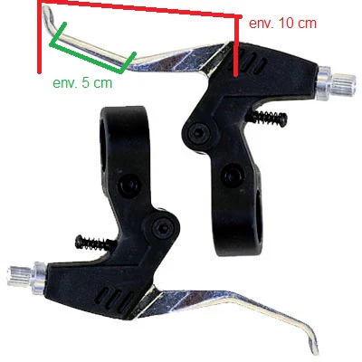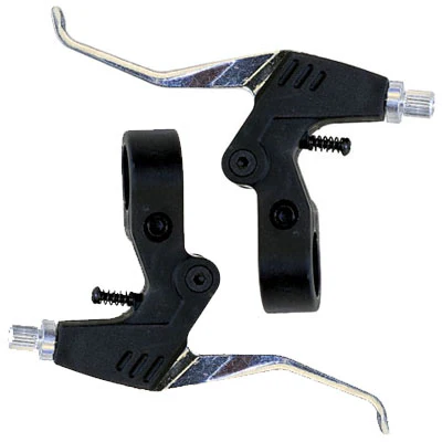 Fabriqués en aluminium et en plastique, ces poignées de frein de vélo sont conçues pour être actionnées par deux ou trois doigts de la main. La tension du ressort qui fait revenir la poignée à sa position originale est réglable par vis. La tension du câble de frein peut être ajustée à l’aide d’un écrou.