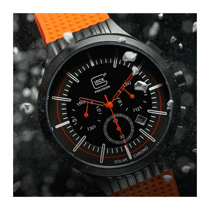 La fonction chronographe apporte un contrôle précis des timings de patrouille et des séquences d’opération. Deux bracelets interchangeables accompagnent la montre pour adapter l’équipement au contexte de la mission : une maille noire mate avec fermoir à pression pour une tenue stable, et un bracelet en silicone orange à boucle ardillon intégrant la structure Glock RTF pour le confort et le maintien. Le changement rapide facilite l’ajustement immédiat selon les priorités.