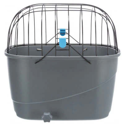 Le tapis amovible au fond du panier est lavable en machine à 30 °C. La grille est en métal et le panier est en plastique ; il se lave également facilement. Ses dimensions sont 36 cm de large × 46 cm de long. Le panier mesure 27.5 cm de haut sans la grille et 47 cm de haut avec la grille ; une hauteur agréable pour que le chien se sente en sécurité dans le panier. Le produit est recyclable. Son poids est de 2.5 kilos.