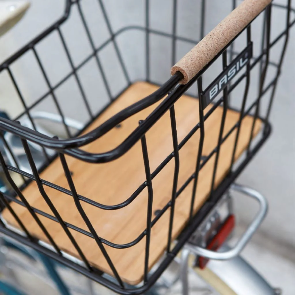 Le panier Basil Nordland est en acier, avec un fond en bambou. Il offre un grand espace de transport de 23 L, avec ses dimensions extérieures de 23 x 33 x 19 cm, et peut porter jusqu’à 10 kg. Un dégagement a été prévu côté selle, pour une installation à l’arrière du vélo ; mais il peut tout aussi bien être installé sur un porte-bagages à l’avant. Le panier est doté d’une poignée agréable au toucher en liège et caoutchouc afin qu’il soit pratique à manier lorsque vous le transportez à pied.