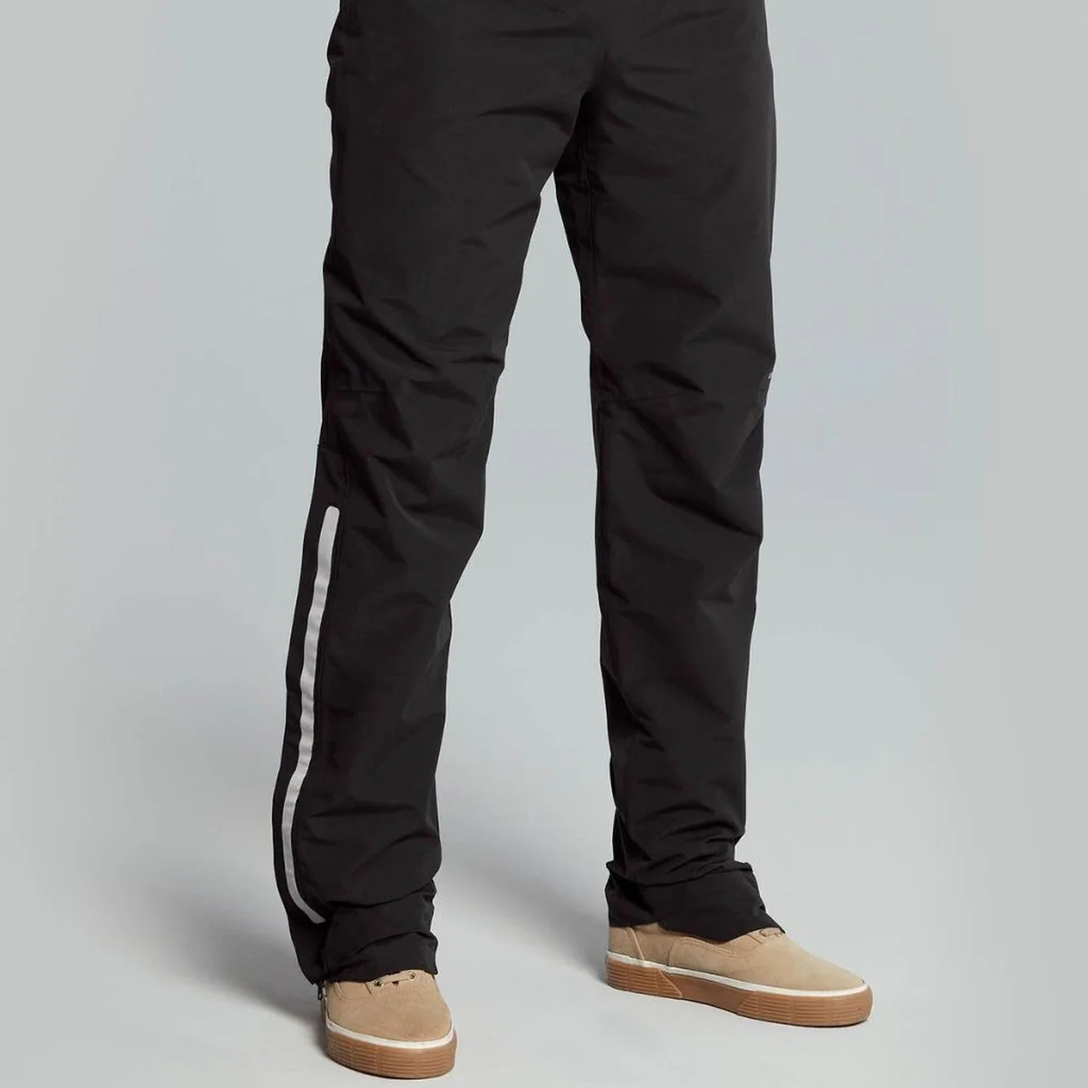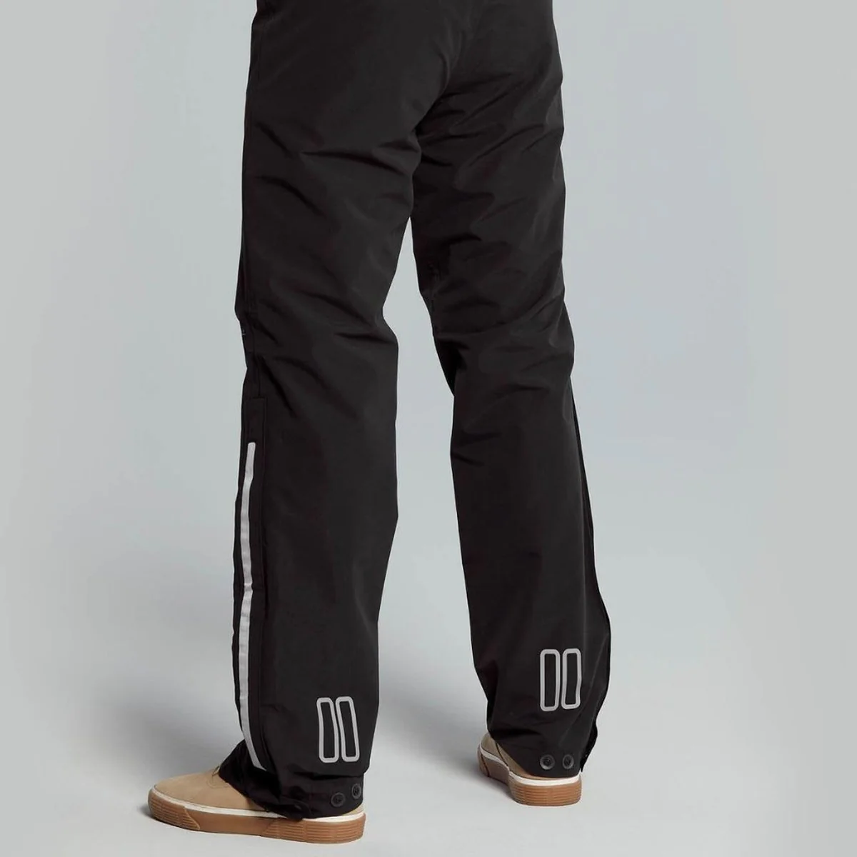 Le pantalon est équipé d’une fermeture éclair latérale de 50 cm, permettant de l’enfiler facilement par-dessus un pantalon de ville ou une tenue de sport. Le bas de jambe ajustable améliore le maintien et limite les projections d’eau. Un rabat supplémentaire protège les chaussures contre la pluie.