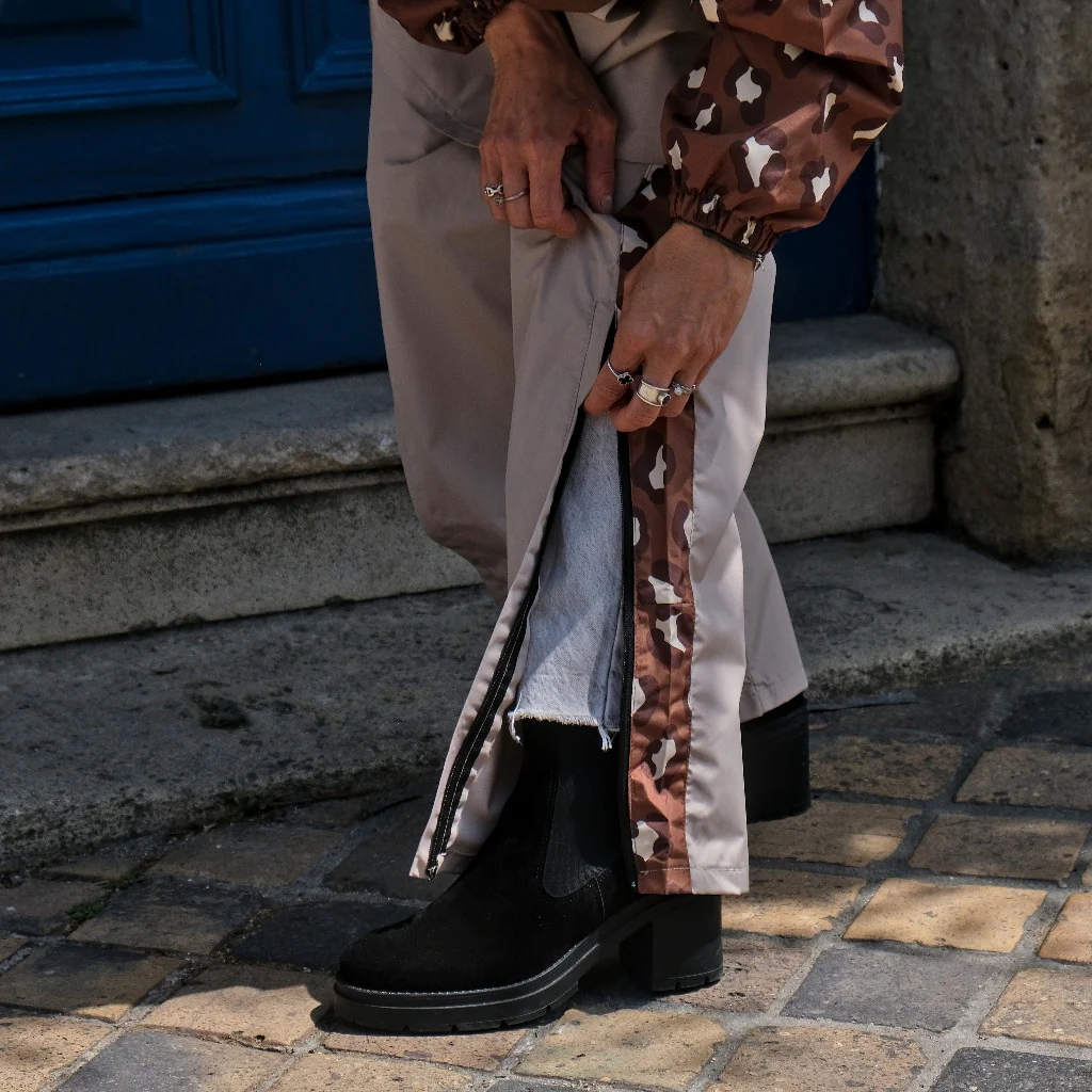 Le pantalon Léopard Poule Party est pensé pour s’enfiler en un clin d’œil grâce à ses longues fermetures éclair latérales, sans avoir besoin de retirer vos baskets ou vos talons. Compact et malin, il se replie dans une pochette intégrée de seulement 15 cm, facile à glisser dans votre sac. Et pour transporter vos essentiels, vous disposez de deux poches latérales zippées et d’une poche arrière à velcro.