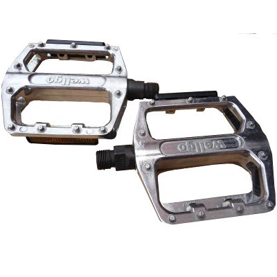 En aluminium moulé d’un bloc, ces pédales de 600 g ont une résistance élevée aux chocs. L’axe est de 9/16, taille de filetage qu’on retrouve sur la très large majorité des vélos adulte. Munies de catadioptres réfléchissants pour plus de sécurité, les pédales argent sont aussi disponibles en pédales noires Wellgo avec un filetage 1/2 pour les vélos enfants :