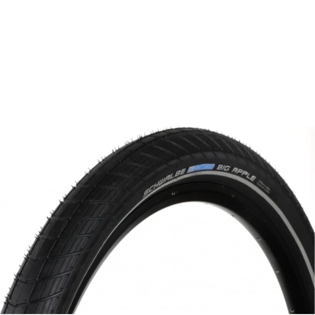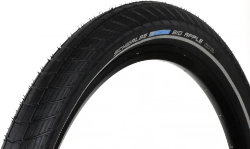 Le pneu Schwalbe Big Apple est doté du mélange de gomme Endurance qui procure une longévité maximale. Les flancs SkinLite sont légers et fins. Une bande nervurée sur toute leur longueur permet l’utilisation optimale d’une dynamo bouteille. Les flancs sont aussi dotés de la bande réfléchissante Reflecto, pour une visibilité sous faible luminosité.