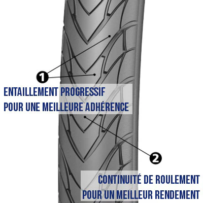 Le pneu vélo tout chemin Protek de Michelin s’utilise quotidiennement sur asphalte et sur terre battue. Son mélange de plusieurs gommes offre de plus grandes longévité et robustesse avec une sculpture qui facilite le roulage. La structure continue sur la bande de roulement et la profondeur d’entaille élevée sur les épaules apporte une excellente adhérence sur sol humide et gras. En effet, les rainures profondes aux épaules et moins prononcées au centre permettent à la fois un bon rendement et une bonne accroche sur sols mouillés et glissants.