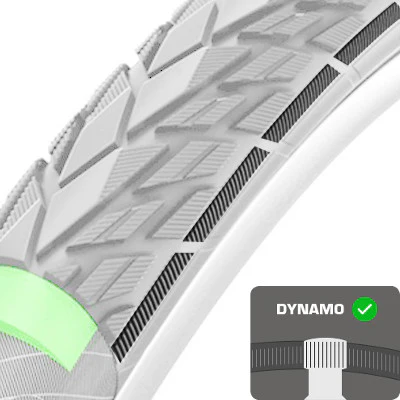 Pour les cyclistes qui se déplacent la nuit, ou par faible visibilité, ce pneu est équipé d’une bande réfléchissante sur le flanc de manière à être bien vu par les autres usagers de la route. Le pneu est également doté d’une bande spéciale pour dynamo. La roulette de la dynamo accroche ainsi mieux au flanc du pneu.