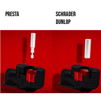 Cette pompe possède un système de raccord ingénieux s’adaptant de façon simple et rapide à la valve, par glissement d’un curseur. Elle est ainsi compatible avec les valves Schrader, Presta et Dunlop.