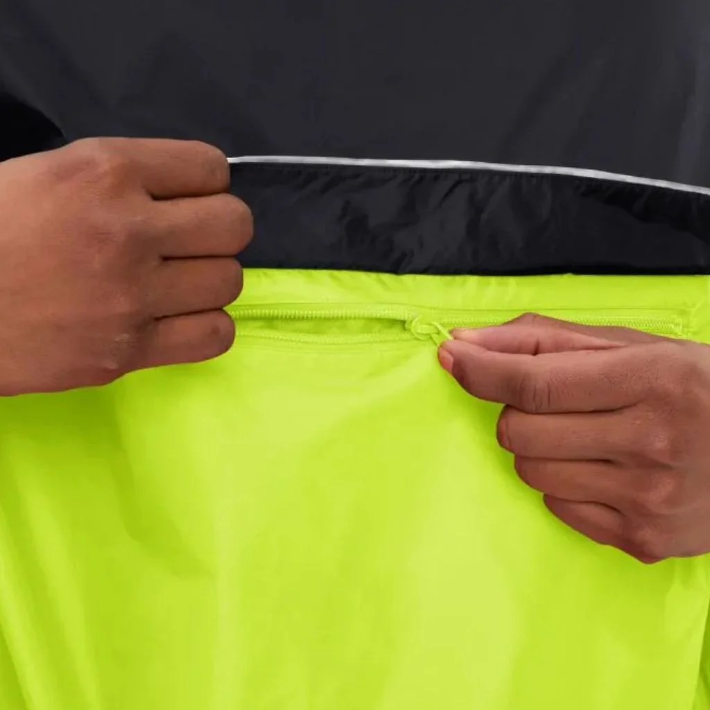 Une poche de rangement habille la poitrine. Sa couleur jaune (Lemon) vive et les éléments réfléchissants accroissent la visibilité du cycliste. Le poncho rentre en entier dans sa propre poche. Plié de cette façon, il est tellement compact qu’il est facile de l’avoir en permanence avec soi.