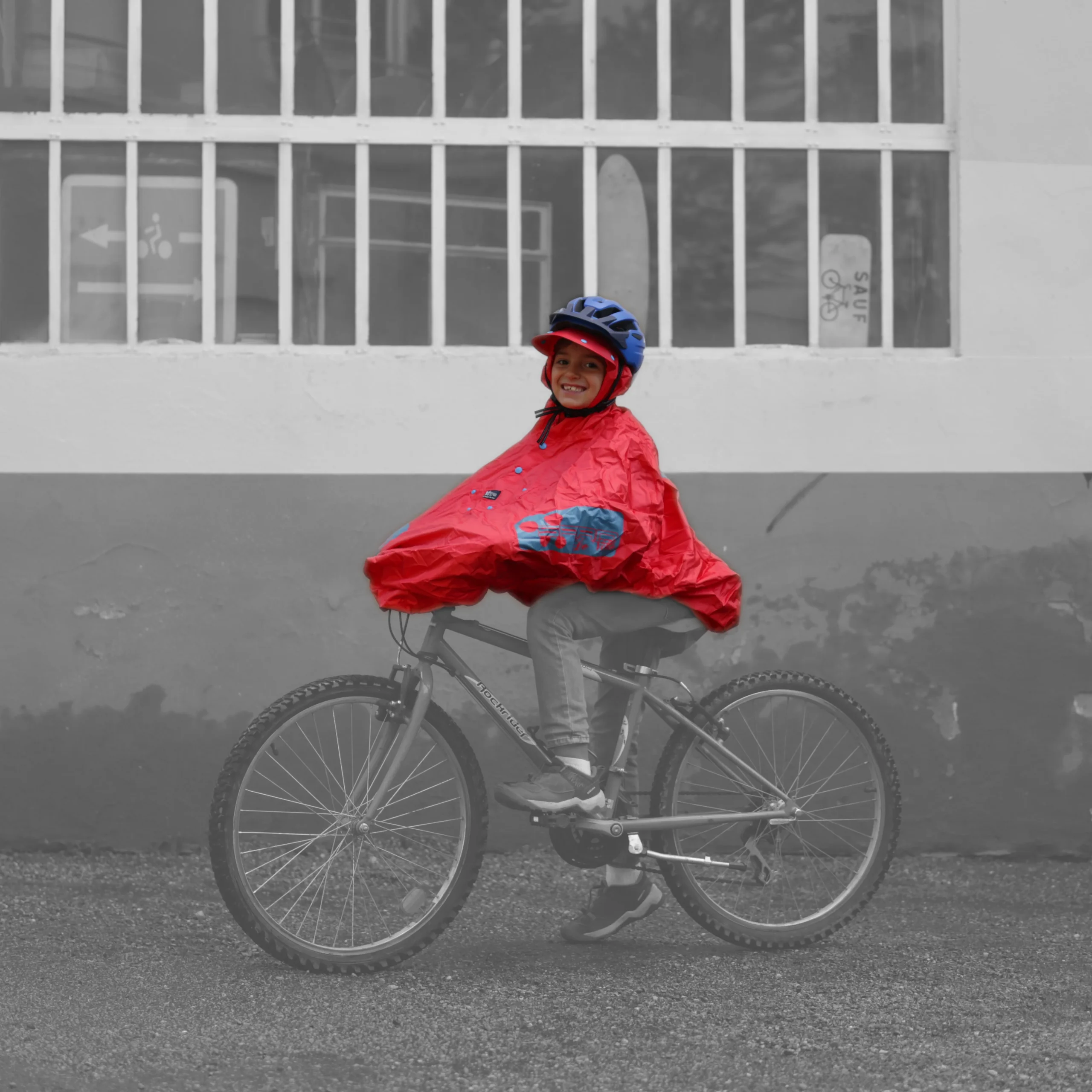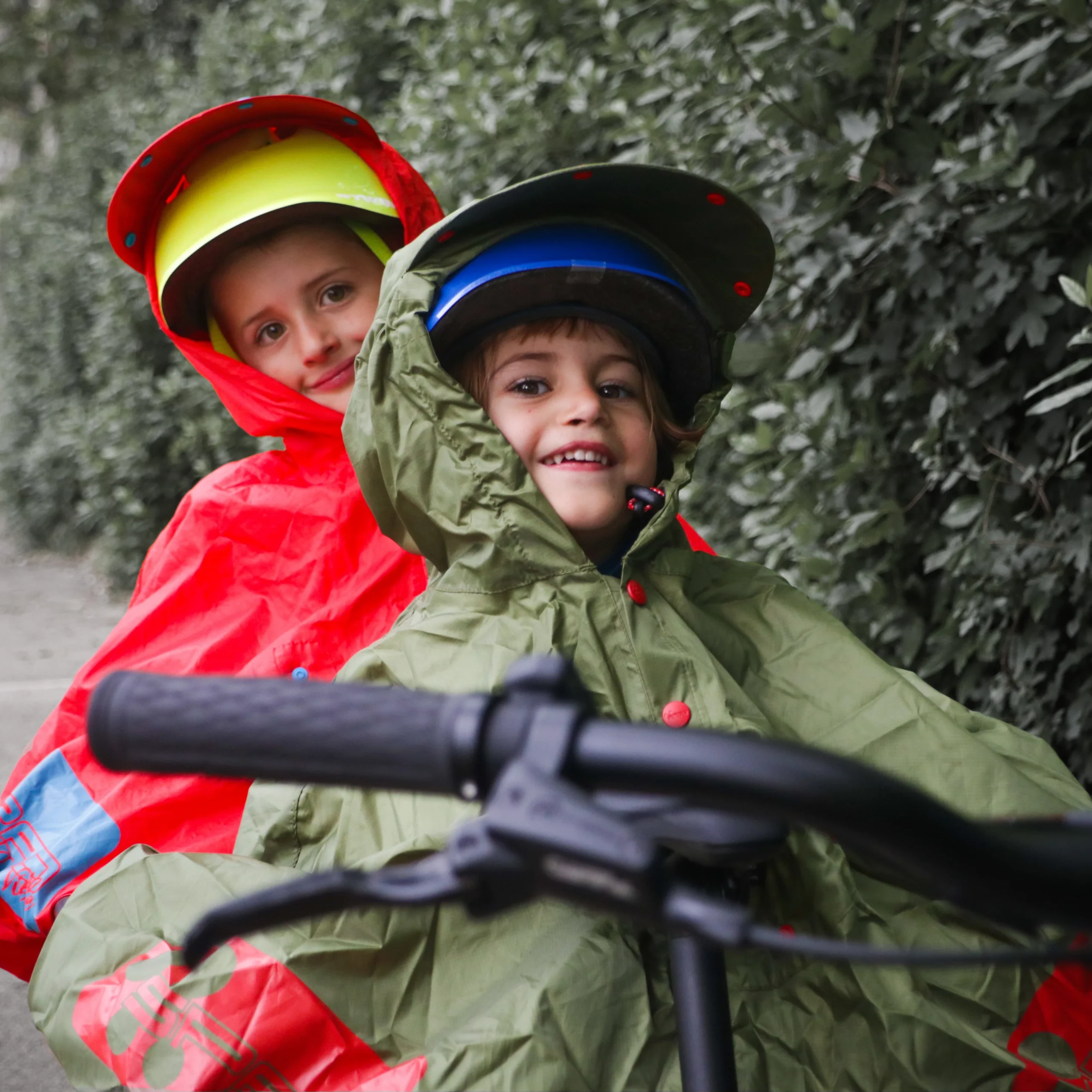 - Le poncho Fulap Junior pour les enfants à vélo : une fois que votre enfant est assez grand pour avoir son propre vélo ou sa draisienne, utilisez la cape de pluie de façon classique. Le système KDS® permet alors de maintenir la cape afin qu’elle ne se soulève pas avec le vent. L’élastique passe devant le guidon et derrière la selle, ce qui permet également de couvrir les cuisses et les genoux de votre enfant. Dans les deux cas de figure, le poncho est parfaitement adapté pour le port d’un casque vélo enfant, obligatoire pour les moins de 12 ans.