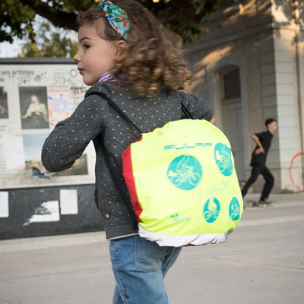 En effet, le poncho Fulap est fourni avec son sac de transport. Très léger, il pèse 350 grammes. Ses dimensions sont : 20 x 20 x 5 cm. Hautement réfléchissant (conforme à la norme EN 471), ce sac se porte en sac à dos par l’enfant et agit alors à la manière d’un gilet de sécurité. Le sac est d’ailleurs assez grand pour que l’enfant puisse y mettre son casque, une fois descendu du vélo. Le poncho dispose également de motifs réfléchissants sur ses trois faces pour une excellente visibilité.