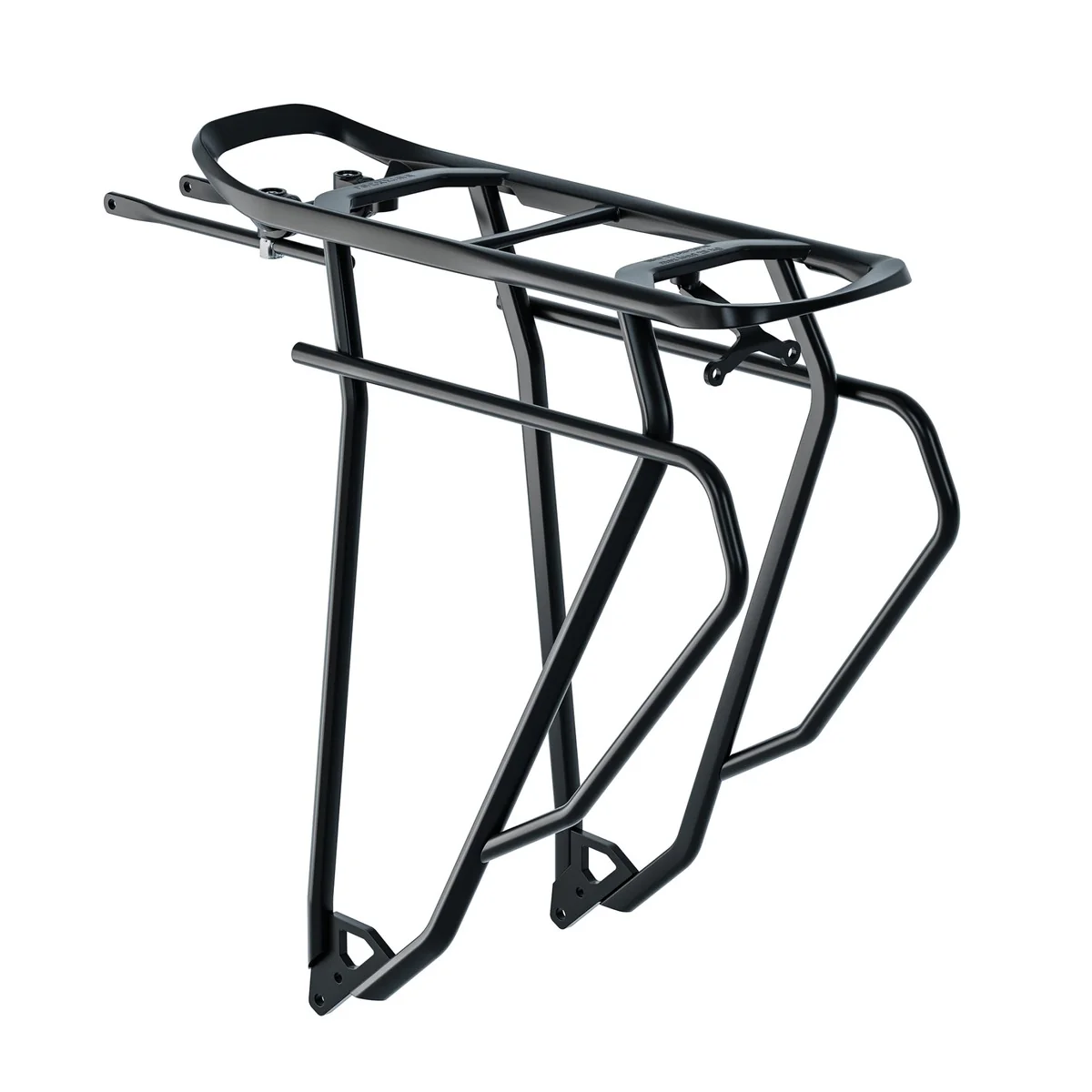 Ce porte-bagage noir en aluminium allie légèreté et robustesse. Il pèse 918 g. La structure géométrique de ce support pour bagages vélo permet un maintien stable des sacoches latérales. Il est équipé d’une fixation pour pompe de vélo intégrée ainsi que d’œillets de fixation pour garde-boue.