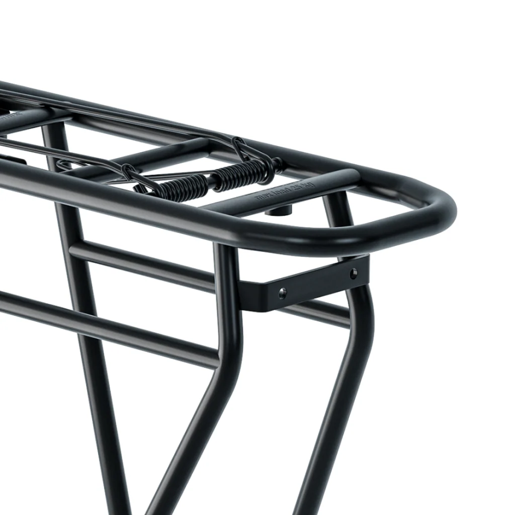 Avec ses 920 grammes seulement, ce porte-bagages ne pèse pas lourd sur la balance. Pourtant, il supporte jusqu’à 25 kg et bénéficie d’une garantie de 10 ans. Il est aussi livré et monté avec un ressort de maintien sur le plateau supérieur, permettant de bloquer un sac léger ou un vêtement, et une platine pour installer un feu arrière. À noter : il n’est pas conçu pour accueillir un siège enfant.