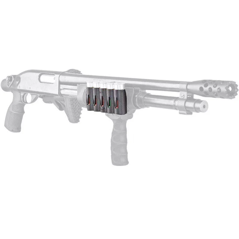 Compatible Riotgun en calibre 12, il se fixe sur rail Picatinny et assure un positionnement stable, un accès direct et une manipulation fluide, utile en mission comme en patrouille sur terrain contraignant. La rétention maintient les cartouches sans jeu tout en autorisant une extraction nette sous stress.
