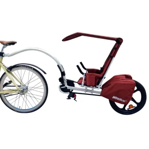 Encore plus pratique, découvrez aussi la remorque vélo enfant Weehoo Thrill vendue avec un toit et une protection pluie.