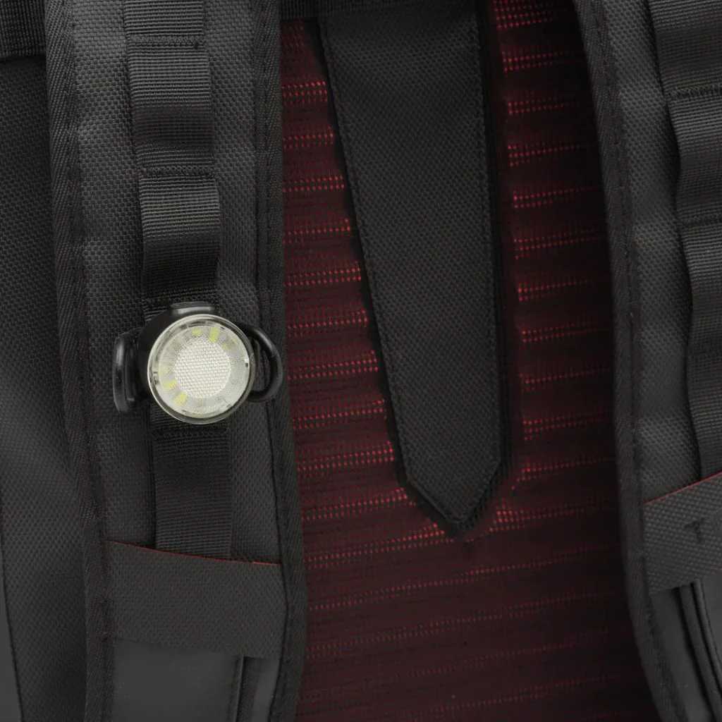 - Visibilité : les impressions noires réfléchissent la lumière des phares des voitures, et les sangles sur le devant du sac et sur les bretelles sont pensées pour porter un accessoire lumineux comme la LED clipsable Abus.