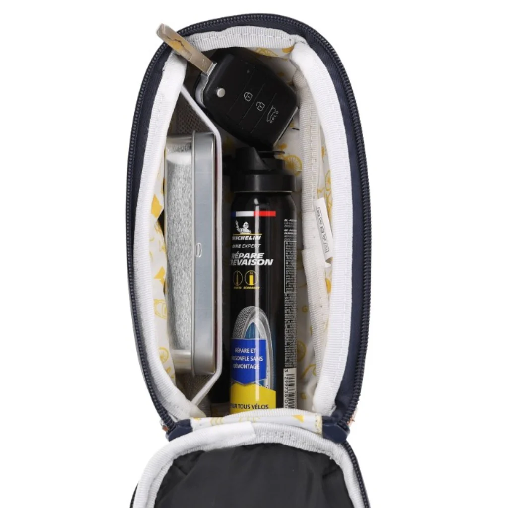 La sacoche se fixe facilement sur la partie supérieure du cadre (top tube) du vélo à l’aide de 3 sangles de fixation auto-agrippantes. Elles assurent ainsi une bonne stabilité à la sacoche et évitent qu’elle ne bouge pendant que vous roulez.