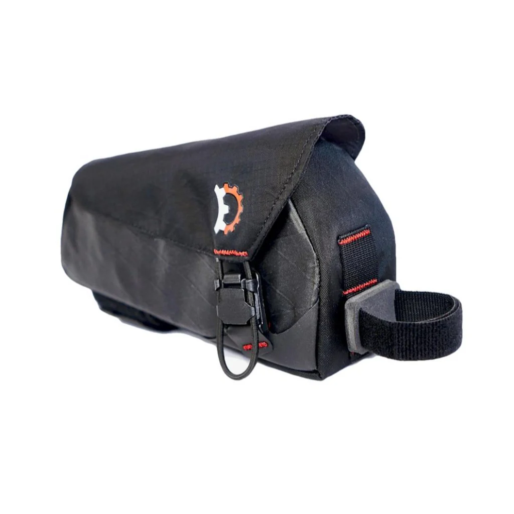 La sacoche se fixe avec 2 bandes velcros, une sur le cadre et l’autre sur la potence. Cette sacoche est conçue en plaque rigide PEHD avec un tissu VX21 laminé aussi utilisé pour les voiles de bateau. Grâce à ces matériaux, la sacoche est déperlante et résistante à l’eau. La sacoche ne pèse que 130 g pour un stockage de 1L.