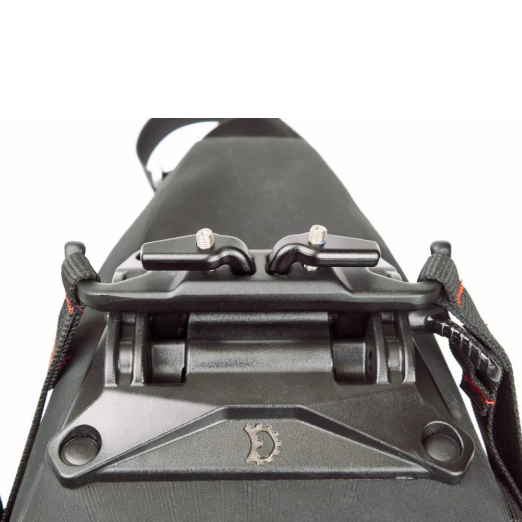 Le montage de la Spinelock est remarquablement stable grâce à son système spécifique de fixation. Ce système est composé de trois éléments essentiels : le collier de selle, la plaque de base « Spine » attachée au sac de selle et la goupille. Ce système élimine efficacement le balancement latéral, assurant ainsi une conduite fluide même sur les terrains les plus accidentés. Le support Spinelock fourni avec la sacoche, se fixe solidement aux rails de la selle à l’aide d’une clé à étoile T25. Il est compatible avec tous les modèles de selles équipés de rails standards, à l’exception des selles Brooks en cuir.