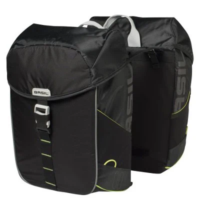 D’une capacité totale de 34 L, ces sacoches vélo sont assez grandes pour y ranger vos courses, toutes vos affaires pour le travail ou les études ou pour partir en cyclotourisme quelques jours. Leur taille de 34 x 19 x 43 cm permet aussi des les porter à la main grâce à leurs poignées. De couleur noire, ces sacoche arborent des détails en vert lime et une bande en tissu réfléchissant visible de tous les côtés. Une petite boucle sur chacune des sacoches permet d’accrocher un phare rouge de vélo pour encore plus de visibilité.