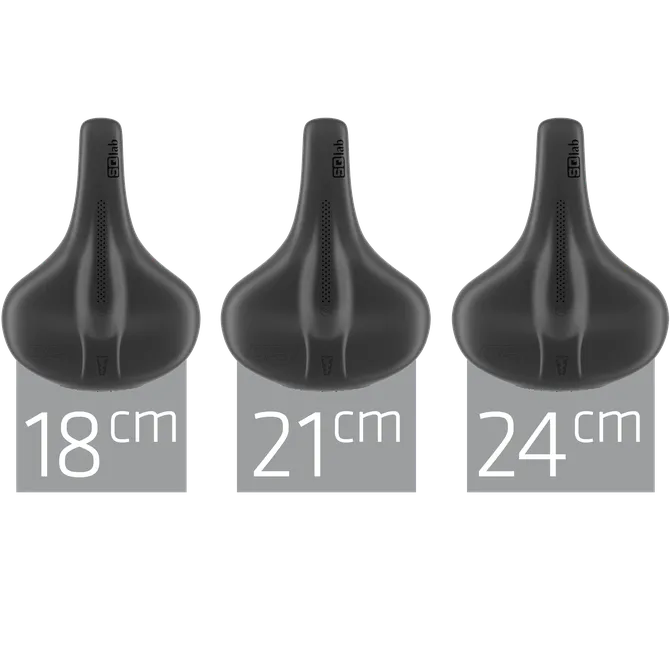 Et pour s’adapter à chaque morphologie, cette selle vélo unisexe de 27.7 cm de long est aussi proposée en 3 largeurs :