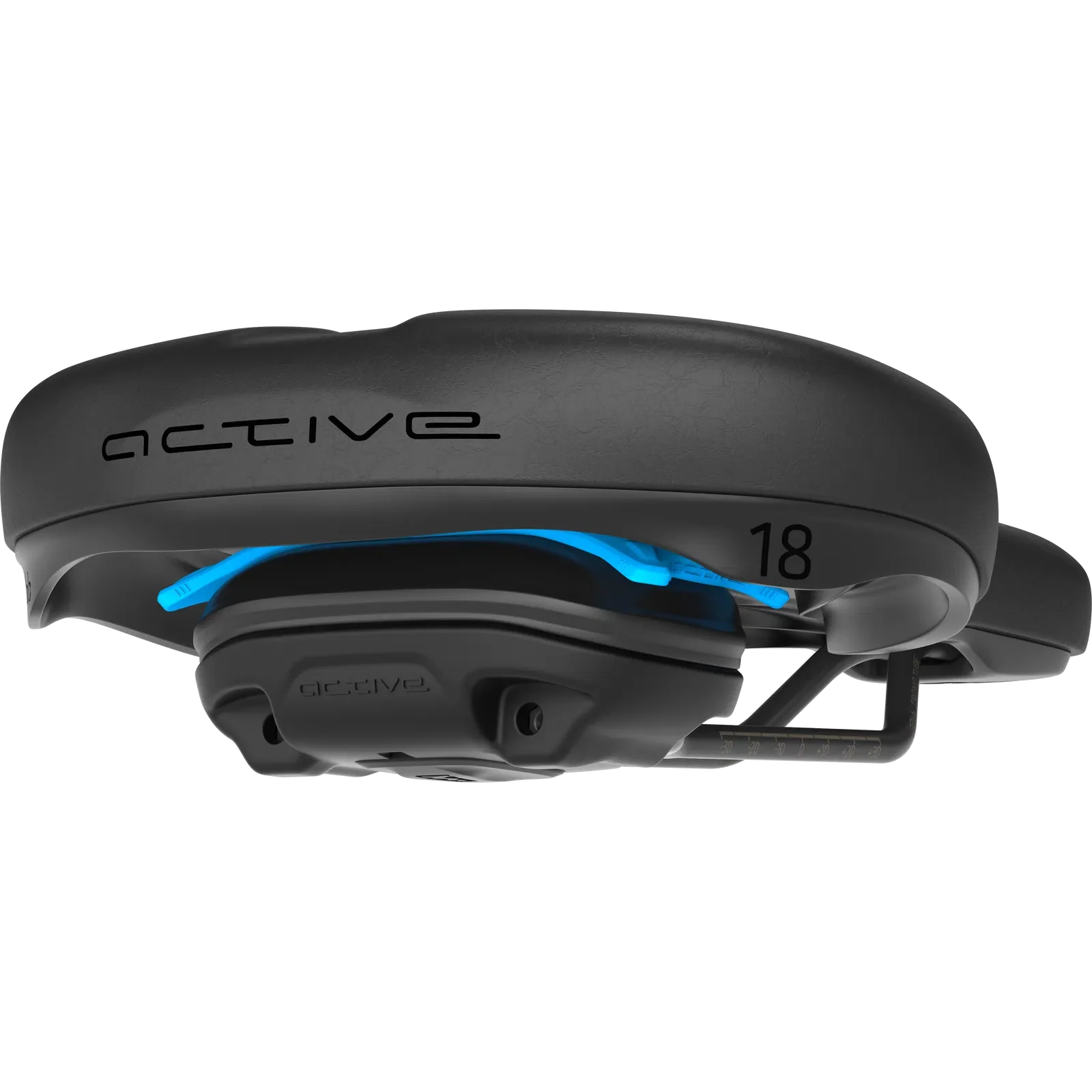 La selle vélo SQlab est aussi dotée de la technologie Active de SQlab (voir photo 5) : c’est-à-dire que sa construction suit le mouvement latéral du bassin lorsque le cycliste pédale pour augmenter son confort mais aussi l’efficacité de son pédalage. En effet, le cycliste ressent alors moins de pression sur les disques intervertébraux et la pression sur les ischions s’en trouve encore réduite. Il est possible d’ajuster la flexibilité du mouvement actif en fonction du poids du corps de chaque cycliste à l’aide de 2 à 4 bâtons à placer dans l’amortisseur situé sous la selle