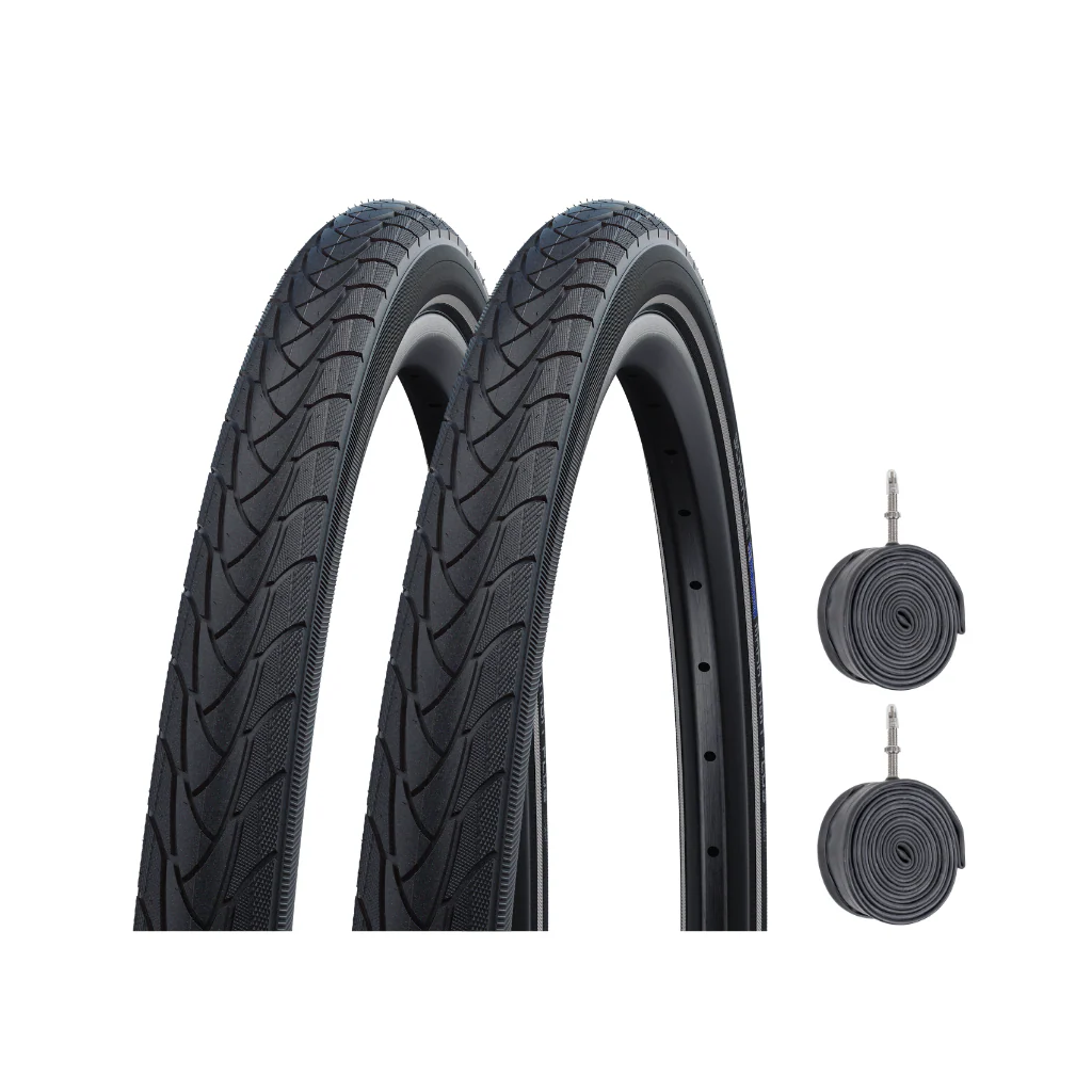 Retrouvez un set comprenant 2 pneus Schwalbe Marathon Plus et 2 chambres à air correspondantes.