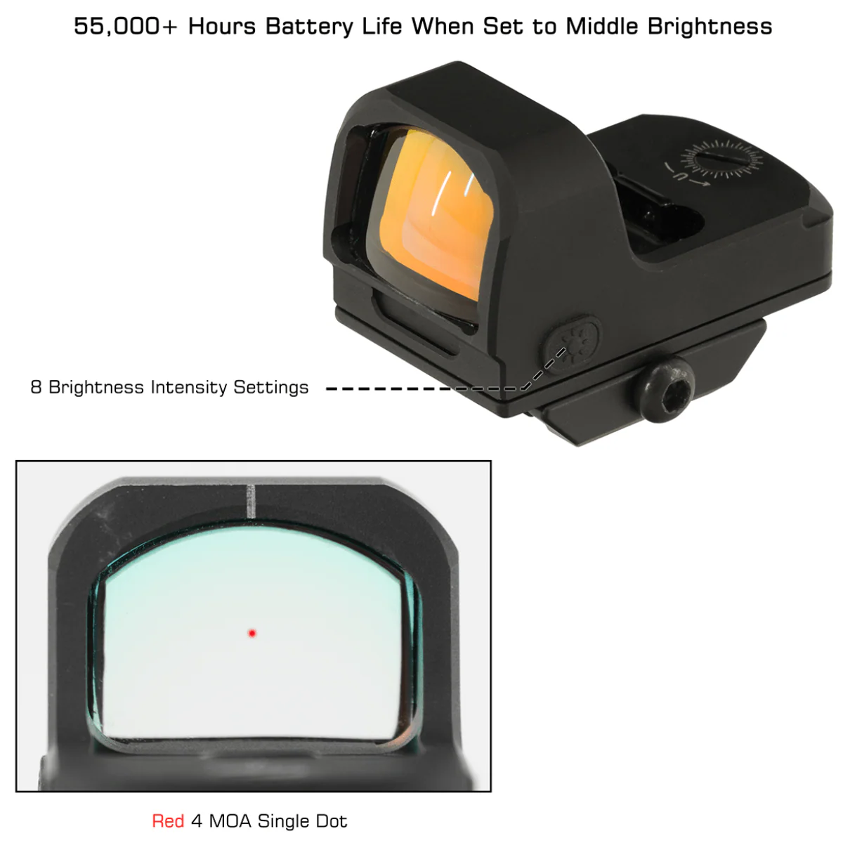 Le point rouge ou vert de 4 MOA offre 8 niveaux d’intensité afin d’ajuster la visée à la luminosité ambiante. Le compartiment de pile magnétisé limite les interruptions et élimine les scintillements, ce qui garantit une image de réticule stable. Les clics de 1 MOA autorisent des corrections fines et rapides. L’autonomie dépasse 55 000 heures en rouge et 22 000 heures en vert à un réglage moyen, ce qui améliore la disponibilité et l’efficacité sur la durée.